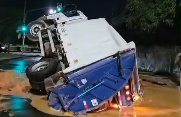Caminhão cai em cratera na Avenida Coronel Teixeira e causa transtornos em Manaus