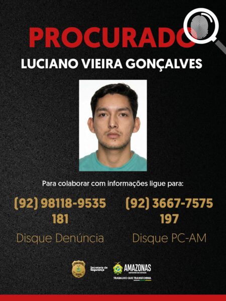 Manaus (AM) – A Polícia Civil do Amazonas (PC-AM) divulgou imagens de Luciano Vieira Gonçalves, de 33 anos, suspeito pelo homicídio de Cibele Felix de Lima, de 20 anos, ocorrido na madrugada do dia 14 de fevereiro, no bairro Petrópolis, zona sul de Manaus.